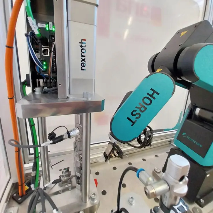 La station d’assemblage CERAFLEX est composée d’un robot six-axes de Fruitcore Robotics et de la presse électrique Smart Function Kit Pressing de Bosch Rexroth. Cette presse permet la mise en œuvre simple et rapide de différentes opérations d’assemblage mais aussi de fonctions de mesure. Le sous-système mécatronique Rexroth comprend en effet des composants préconfigurés et coordonnés de manière optimale ainsi qu’un logiciel d’exploitation préinstallé.