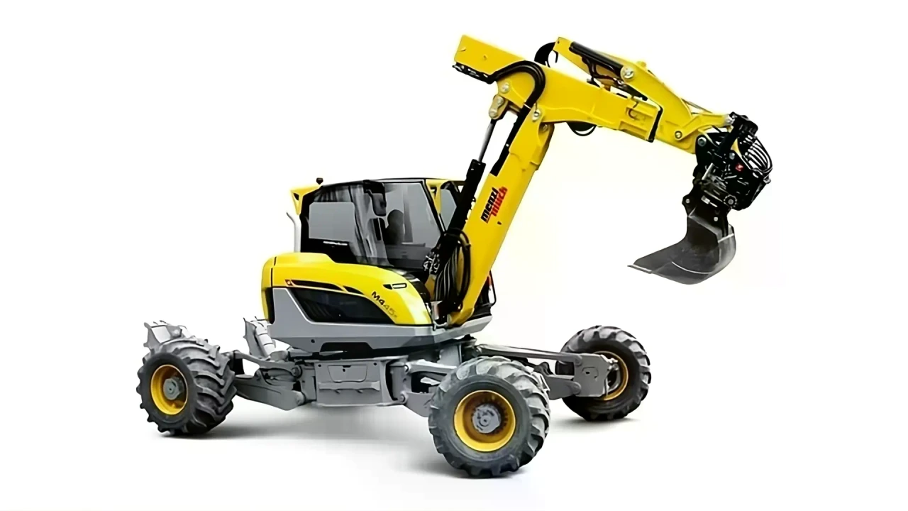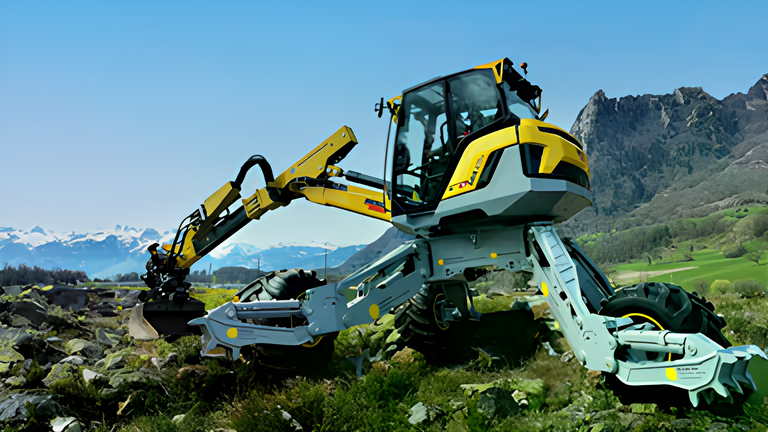 La pelle Menzi Muck M4x s’adapte aux pentes abruptes et aux terrains difficiles grâce à une technologie innovante. L’inclinaison peut être optimisée pour des forces de levage et d’arrachement maximales grâce aux roues et aux pieds griffés réglables. (Source image : Menzi Muck AG)